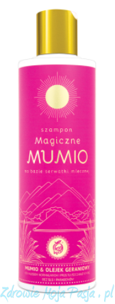Szampon z mumio i olejkiem geraniowym, na bazie serwatki mlecznej.Na porost włosów oraz do wrażliwej skóry głowy. Proteinowy szampon do codziennej pielęgnacji włosów normalnych i przetłuszczających.